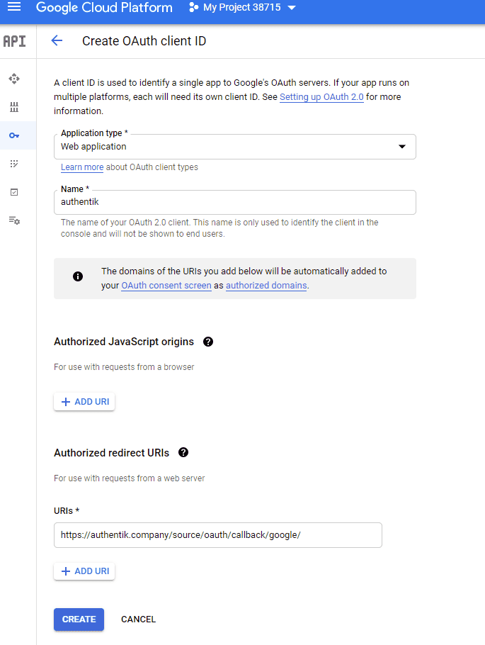 • Authorized redirect URIs: https://authentik.company/source/oauth/callback/google/